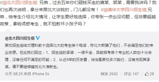6月28日上午,网友“围观”了北京大学四川招生组和清华大学四川招生组在微博上的“掐架”,两校招生组互相指责对方进行诈骗、花钱买考生等行为,但当日双方均删除了骂战微博。